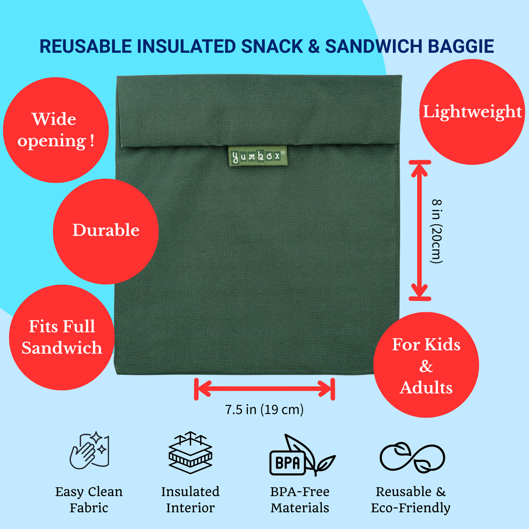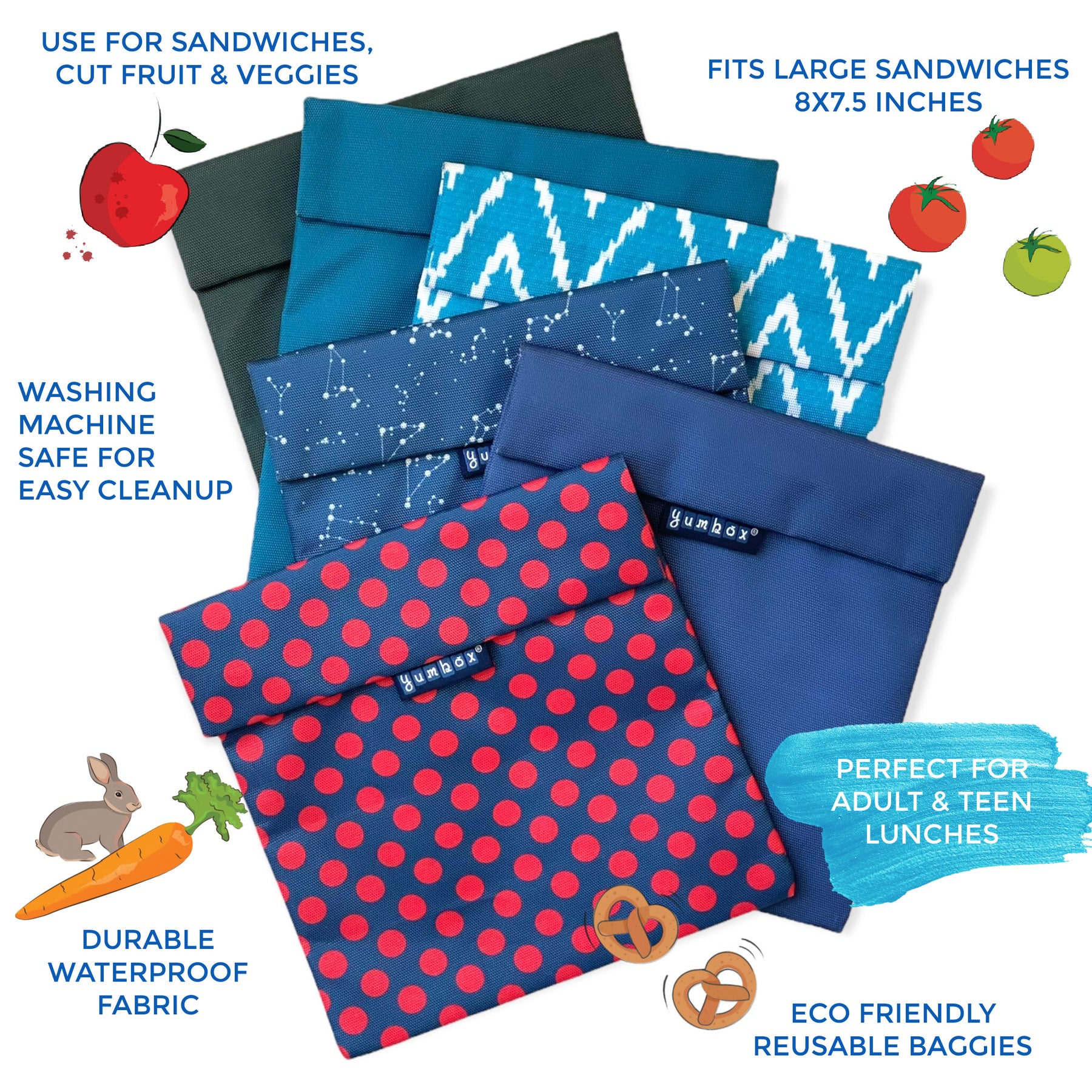 - ZERO WASTE: Say goodbye to disposable packaging and hello to a zero waste solution for packed lunches and snacks. Yumbox reusable fabric bags are just the right size for a sandwich, roll, or wrap, and can also hold a banana, rice cakes, crackers, carrot sticks, and more!