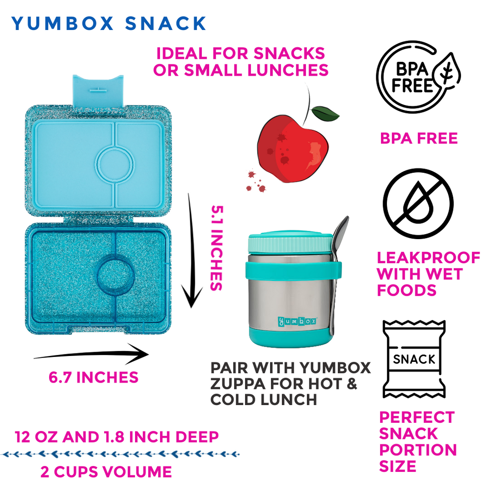 INTRODUCING NEW YUMBOX SNACK! If you liked MiniSnack, you'll love this new Snack size! Each compartment is slightly larger, including the dip well. The latch is also larger to help small hands open and close easily.